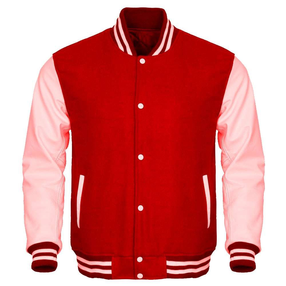 body is made of high-quality Melton Wool and Jacket Sleeves are made of high-quality Cowhide Leather. This varsity jacket comes with a red body, black leather sleeves and red rib with black stripes. The high-quality cotton rib is used for stand up collar, cuffs and hem. This jacket fastening comes with coated snaps on the front and quilted diamond laser lining is used to make warm the jacket.